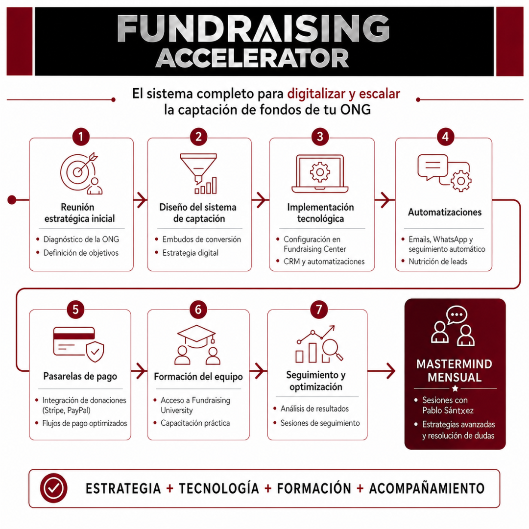 Al unirte al Mastermind de Fundraising, no solo formas parte de una comunidad potente y comprometida, sino que también accedes a una clase mensual con referentes internacionales del sector, donde aprenderás estrategias de alto nivel directamente de quienes las aplican cada día. Estas sesiones incluyen espacio para resolver tus dudas, compartir experiencias reales y llevarte ideas que puedes poner en marcha desde ya.